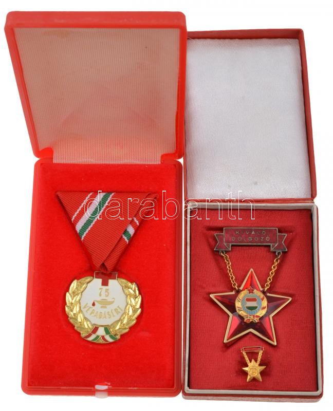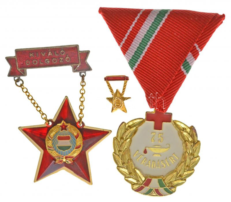 Beschreibung: ~1970-1980. "75. Véradásért" aranyozott, zománcozott fém jelvény mellszalaggal, eredeti tokban + "Kiváló Dolgozó" zománcozott fém jelvény miniatűrrel eredeti tokban T:1-,2