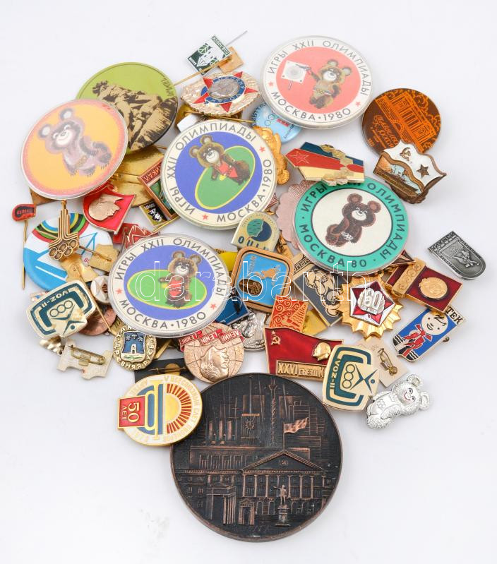 Szovjetunió 70db-os jelvény és kitűző tétel, közte 1db Br plakett "Leningrád", több jelvény a moszkvai olimpiával kapcsolatos T:vegyes