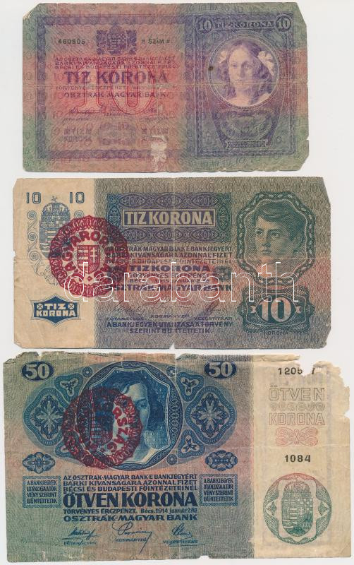 Beschreibung: 10db-os gyengébb tartású korona bankjegy tétel, benne román és magyar felülbélyegzettek T:III-,IV