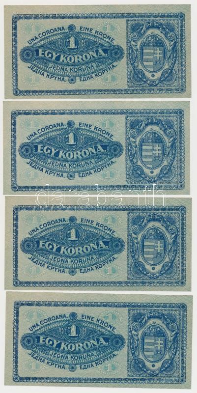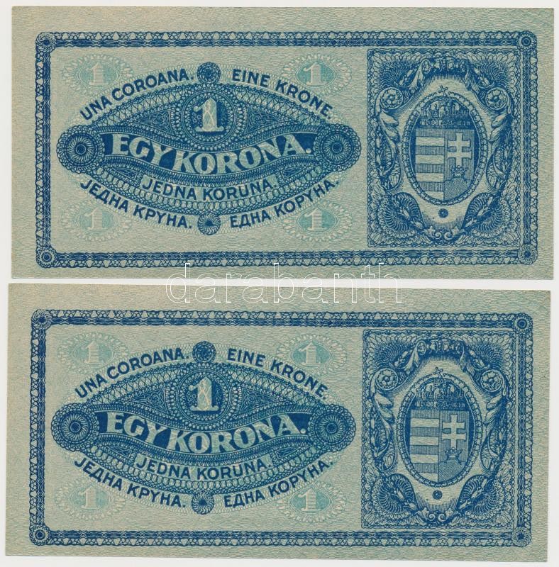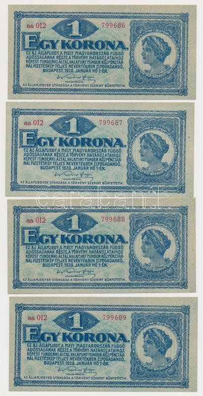 1920. 1K (6x) sorszámkövetők, sötétvörös sorszámmal T:I,I- https://www.darabanth.com/de/266-Fernauktion/266.0/Numismatik/Ungarische-Banknoten~500022/1920-1K-6x-sorszamkovetok-sotetvoros-sorszammal-TI-I-~II1330562