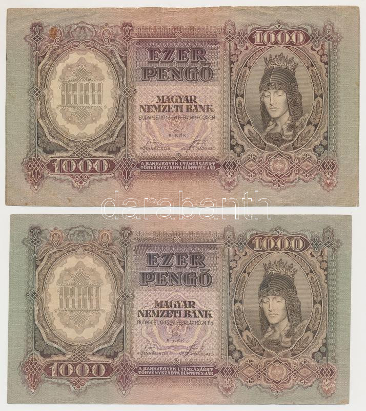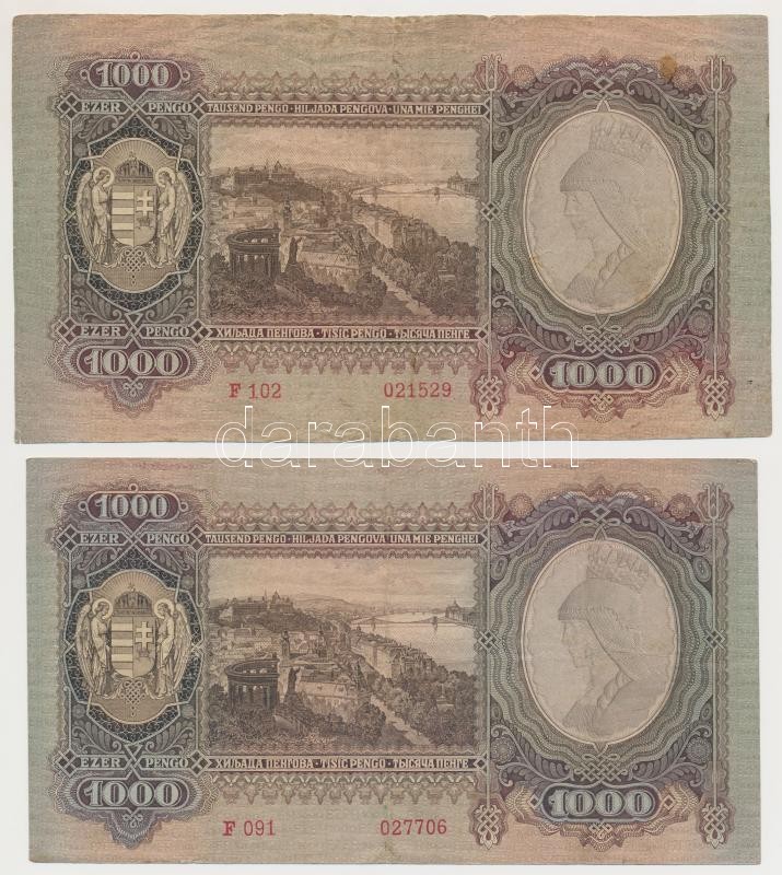 1943. 1000P (2x) T:III,III- https://www.darabanth.com/de/266-Fernauktion/266.0/Numismatik/Ungarische-Banknoten~500022/1943-1000P-2x-TIII-III-~II1333251