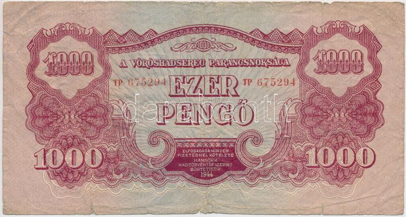 1944. 1000P "A Vörös Hadsereg Parancsnoksága" T:III- https://www.darabanth.com/de/266-Fernauktion/266.0/Numismatik/Ungarische-Banknoten~500022/1944-1000P-A-Voros-Hadsereg-Parancsnoksaga-TIII-~II1336260