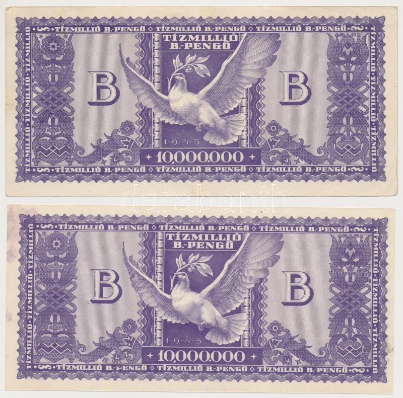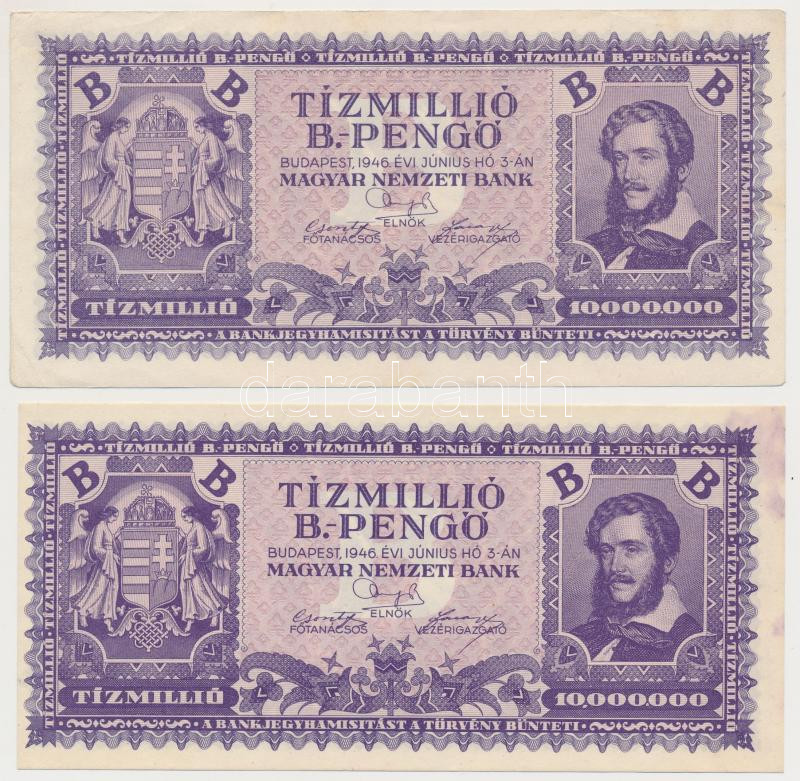1946. 10.000.000BP (2x) egyik elcsúszott nyomat T:I-,II nyomdai festék... https://www.darabanth.com/de/266-Fernauktion/266.0/Numismatik/Ungarische-Banknoten~500022/1946-10000000BP-2x-egyik-elcsuszott-nyomat-TI-II-nyomdai-festekfoltok~II1333143