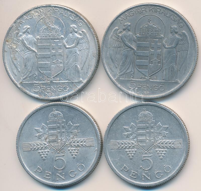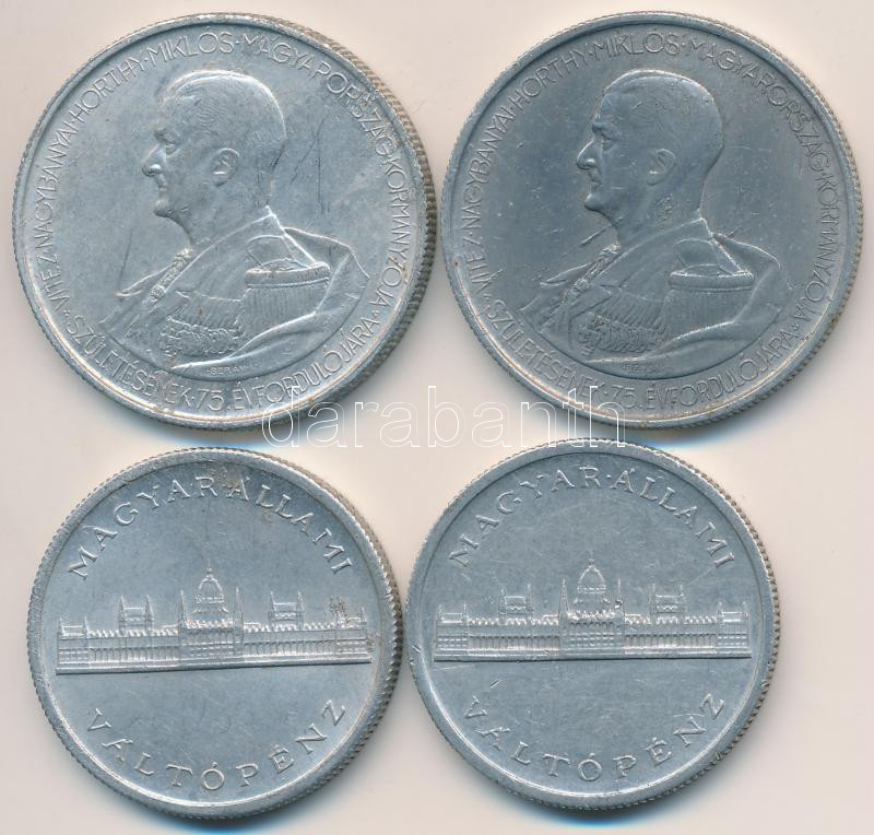 1943. 5P Al "Horthy Miklós születésének 75. évfordulója" (2x... https://www.darabanth.com/de/266-Fernauktion/266.0/Numismatik/Ungarische-Munzen-und-Munzen-mit-ungarischem-Munzzeichen~500008/1943-5P-Al-Horthy-Miklos-szuletesenek-75-evforduloja-2x-plus-1945-5P-Al-Parlament-2x-T~II1335797