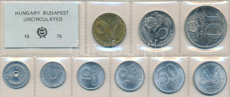 1976. 2f-10Ft 9db klf, érmés forgalmi sor fóliatokban T:1 https://www.darabanth.com/de/266-Fernauktion/266.0/Numismatik/Ungarische-Munzen-und-Munzen-mit-ungarischem-Munzzeichen~500008/1976-2f-10Ft-9db-klf-ermes-forgalmi-sor-foliatokban-T1~II1332146