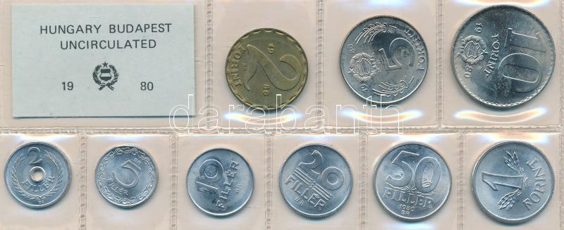 1980. 2f-10Ft 9db klf, érmés forgalmi sor fóliatokban T:1 https://www.darabanth.com/de/266-Fernauktion/266.0/Numismatik/Ungarische-Munzen-und-Munzen-mit-ungarischem-Munzzeichen~500008/1980-2f-10Ft-9db-klf-ermes-forgalmi-sor-foliatokban-T1~II1332114
