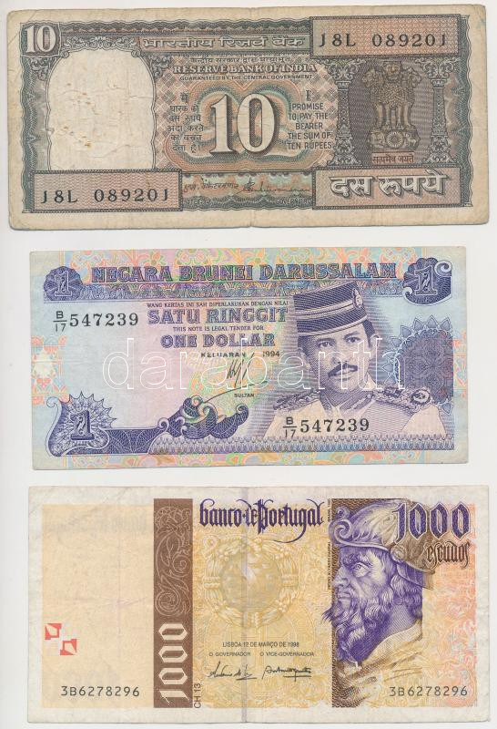 Brunei 1994. 1$ + India 1997-. 10R tűlyukak + Portugália 1998. 1000Esc... https://www.darabanth.com/de/266-Fernauktion/266.0/Numismatik/Weltweit-Banknoten~500011/Brunei-1994-1USD-plus-India-1997-10R-tulyukak-plus-Portugalia-1998-1000Esc-TIII---Brunei-1994-1-Doll~II1331808