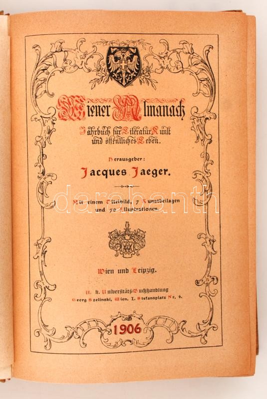 Wiener Almanach für das Jahr 1906. Wien, Jacques Jaeger, 1906. Szecess... https://www.darabanth.com/de/267-Fernauktion/267.0/Andere-Sammelgebiete/Bucher-Andere-Sprachen~38/Wiener-Almanach-fur-das-Jahr-1906-Wien-Jacques-Jaeger-1906-Szecesszios-egeszvaszon-kotesbe~II1342365