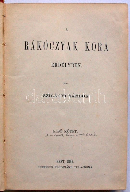 Szilágyi Sándor: A Rákóczyak kora Erdélyben, I. köt. Pest, 1868, Pfeiffer Ferdinánd. Kiadói aranyozott egészvászon kötésben (a gerinc sérült), márványozott lapszélekkel, szép állapotban. Rendkívül ritka