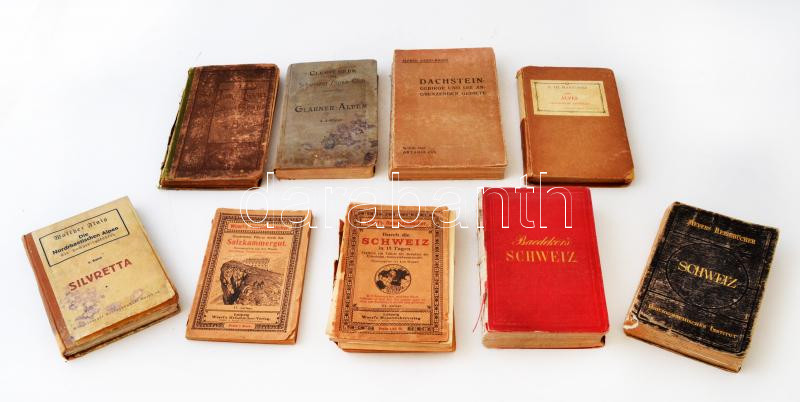 Vegyes utazási könyv tétel: Semmering és környéke, Salzkammergut, Schweiz (Baedeker, Meyer's Reisebücher), Dachstein, Les Alpes, összesen 10 db, példányonként változó, nagyrészt kissé megviselt állapotban, az egyik könyv kis hiánnyal.