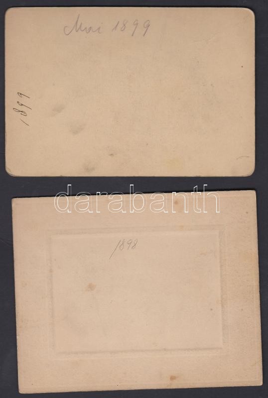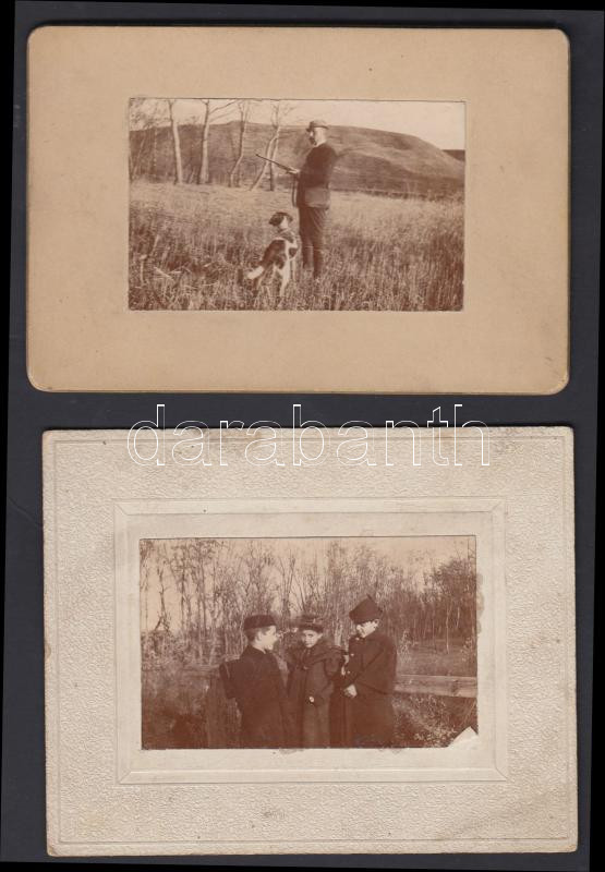 Beschreibung: 1898-1899 2 db vadászfotó: vadász terepen kutyával, ill. gyerekek vadászöltözetben, kartonra ragasztva, hátuljukon feliratozva, 9×13 ill. 10×13 cm