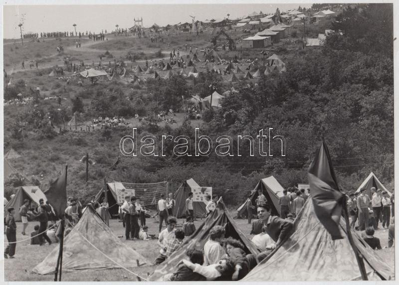 Beschreibung: 1960 Budapest, az úttörőmozgalom 15. születésnapjára rendezett ünnepség az Országház előtt és táborozás Farkas-hegyen, 2 db vintage fotó, 24x17 cm