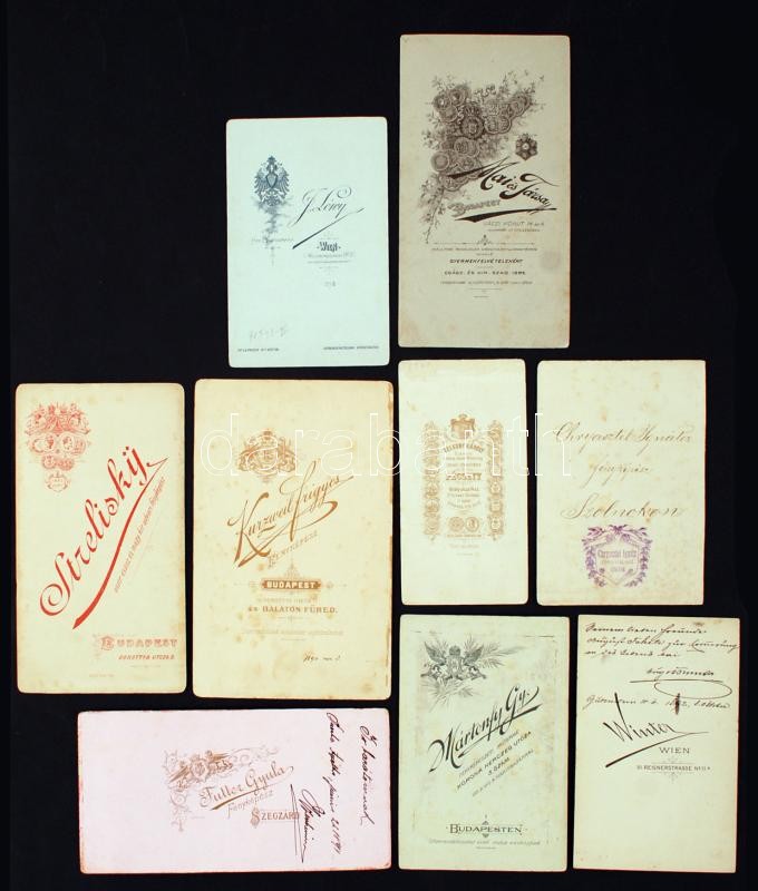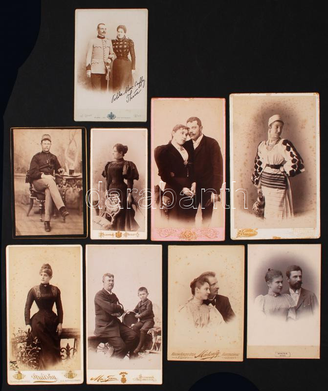 cca 1880-1900 kemény hátú portré fotók (9db), udvari fényképésztől( Mai és Társa, Zelesny,Strelisky,Chryaszte, Mártonfy, Futter, Kurzweil, Winter, Löwy, 16×8-20×11 cm