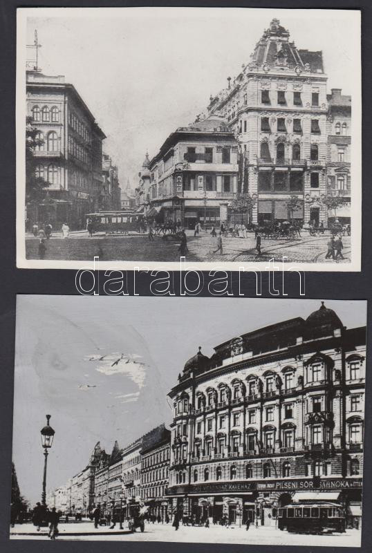 Beschreibung: cca 1900 Villamosok Budapesten, régi városábrázolások másolatai a Füles szerkesztőségének pecsétjével, 2 db fotó, 9x12 cm