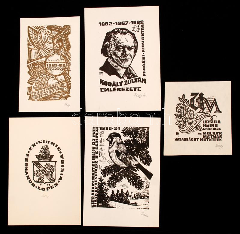 Beschreibung: Fery Antal (1908-1944): 5 db ex libris, fametszet, linó, papír, jelzettek, cca 10x7cm