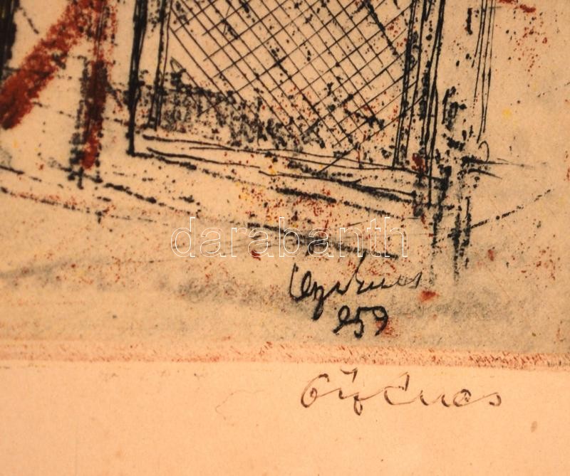 Beschreibung: Ősz Dénes (1915-1980): Tél. Színezett litográfia, papír, üvegezett keretben, 29×37 cm