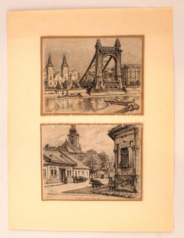 Beschreibung: Sostarics Lajos (1896-1968): Óbuda, Dugonics Titusz tér. Lebombázott Erzsébet-híd. Ceruza, papír, jelzett, kartonlapra ragasztva 14,5×19 cm (2×)