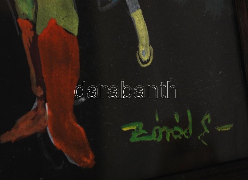 Beschreibung: Zórád jelzéssel: Figyelmeztető kézfogás. Vegyes technika, papír, üvegezett keretben, 37×46 cm