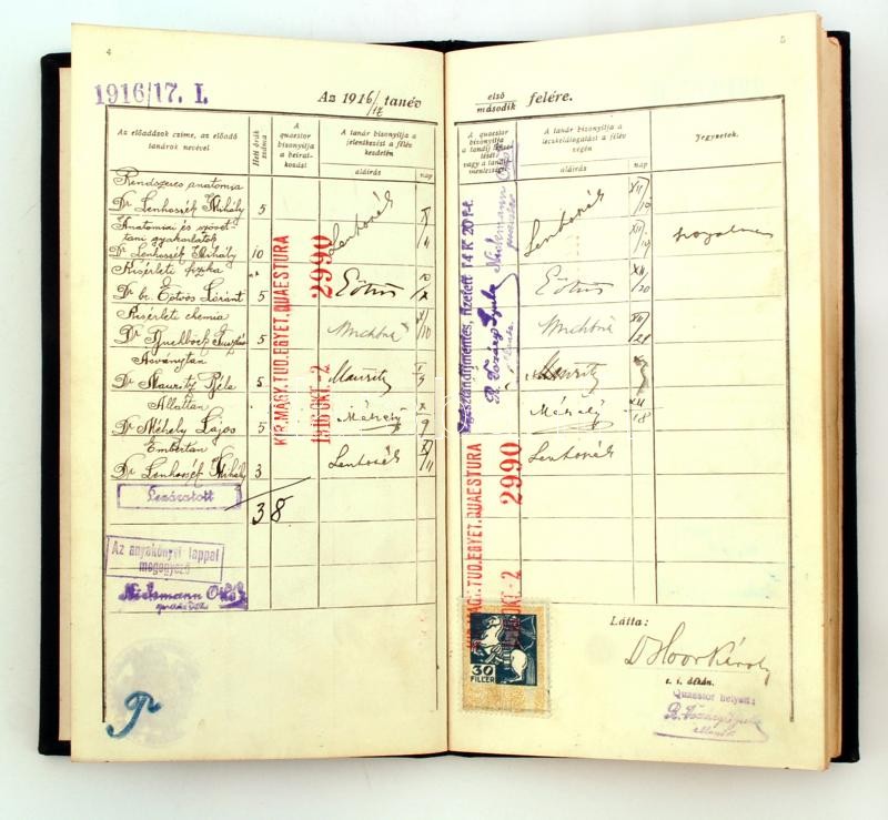 1916 A budapesti magyar királyi tudományegyetem orvostanhallgatójának fényképes egyetemi leckekönyve neves oktatók aláírásaival (Eötvös Loránd, Lehossék Mihály, Méhely Lajos, stb.)