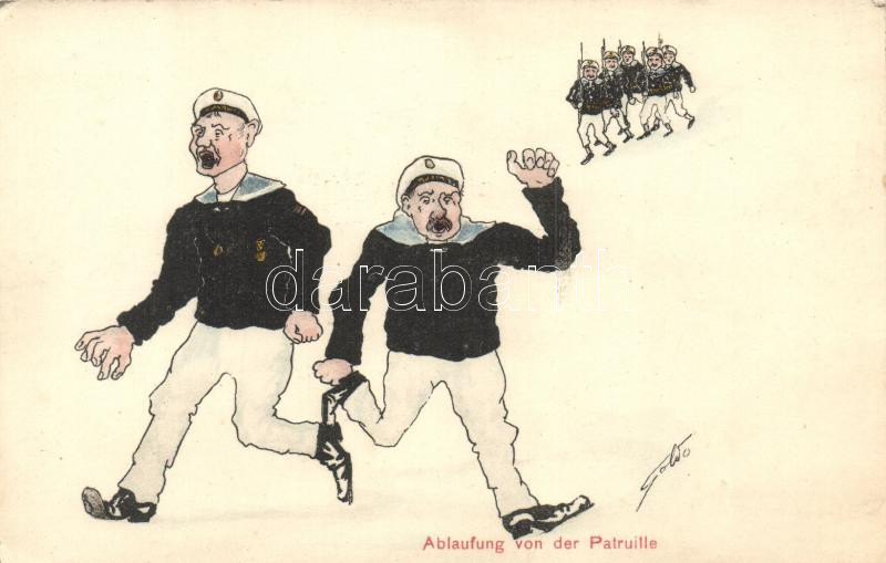 Beschreibung: 'Ablaufung von der Patruille' / Escape from the patrol, Austro-Hungarian mariners, humour, s: Golvo(?) (EK)