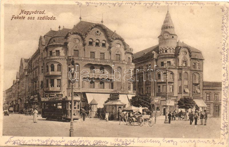 Nagyvárad, Oradea; Fekete Sas szálloda, villamos / hotel, tram, street... https://www.darabanth.com/de/267-Fernauktion/267.0/Ansichtskarten/Siebenburgen~300007/Nagyvarad-Oradea-Fekete-Sas-szalloda-villamos-hotel-tram-street-advertisements~II1341561