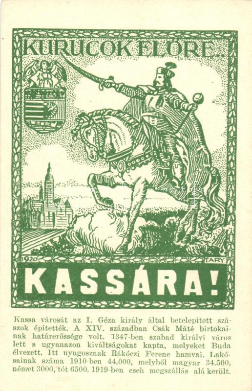 Kassa, Kosice; 'Kurucok előre...', Rákóczi Ferenc lóháton, a város rövid történetével / Hungarian irredenta, Francis II Rákóczi on horseback, short history of the town, s: Tary