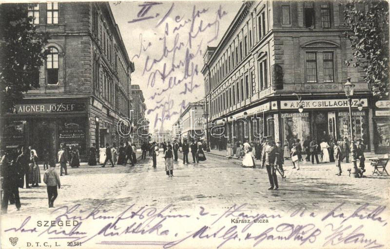 Szeged, Kárász utca, Aigner József üzlete, 'A Kék Csillaghoz' elnevezé... https://www.darabanth.com/de/267-Fernauktion/267.0/Ansichtskarten/Ungarn~300005/Szeged-Karasz-utca-Aigner-Jozsef-uzlete-A-Kek-Csillaghoz-elnevezesu-uzlet-EK~II1343691