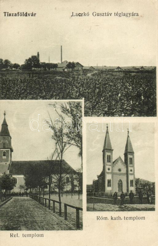 Beschreibung: Tiszaföldvár, Laczkó Gusztáv téglagyára, templomok; Rosenfeld Ernő kiadása
