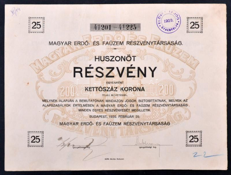 Budapest 1920. "Magyar Erdő- és Faüzem Részvénytársaság" 25 részvénye ... https://www.darabanth.com/de/267-Fernauktion/267.0/Numismatik/Aktien-und-Tickets~400005/Budapest-1920-Magyar-Erdo-es-Fauzem-Reszvenytarsasag-25-reszvenye-egyenkent-200K-rol-~II1336569