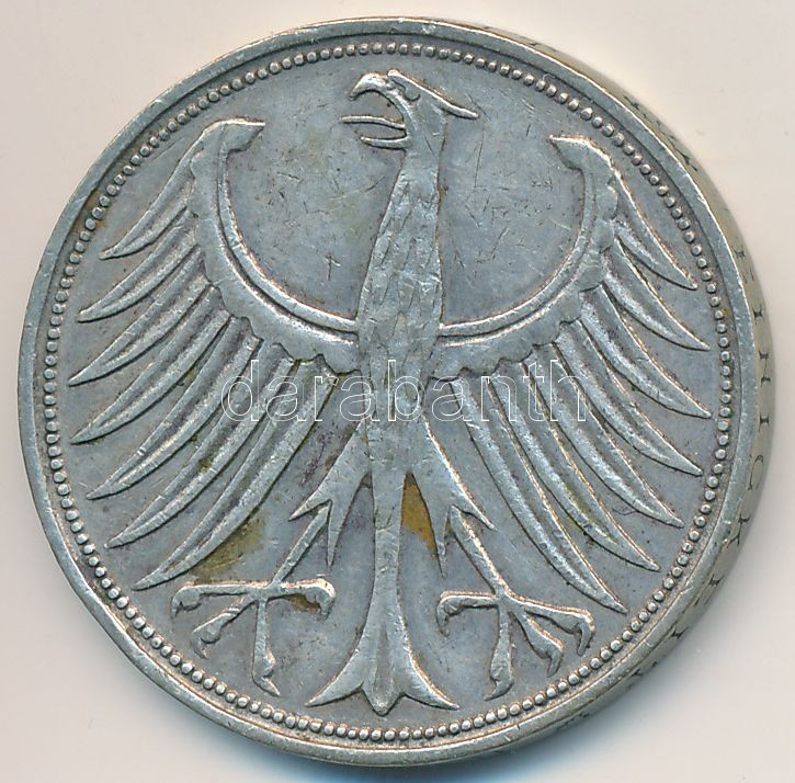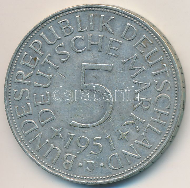 NSZK 1951J 5M Ag T:2- FRG 1951J 5 Mark Ag C:VF