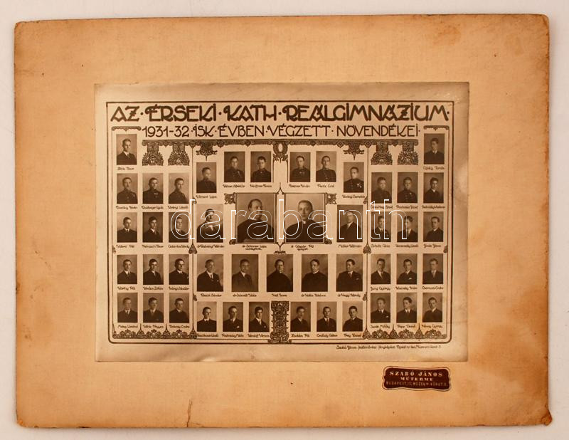 1932 Budapest, az Érseki Kath. Reálgimnázium tanárai és végzett növendékei, kistabló 47 nevesített portréval, Szabó János műterméből, 16x22 cm, karton 25x33 cm