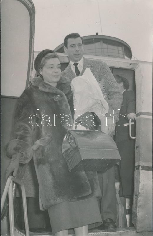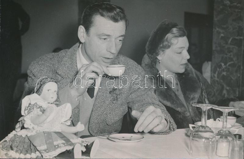 1957 Yves Montand (1921-1991) francia előadóművész Budapestre érkezése és magyar nyelven kiadott könyvének dedikálása közben, Kotnyek Antal (1921-1990) fotóriporter 4 db jelzés nélküli vintage fotója, 18x12 cm