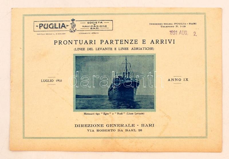1931 Hajó menetrend, Puglia Societá di Navigazione Bari, Prontuari par... https://www.darabanth.com/de/269-Fernauktion/269.0/Andere-Sammelgebiete/Drucksachen~30/1931-Hajo-menetrend-Puglia-Societa-di-Navigazione-Bari-Prontuari-partenze-e-arrivi-pp8-16x24~II1356035