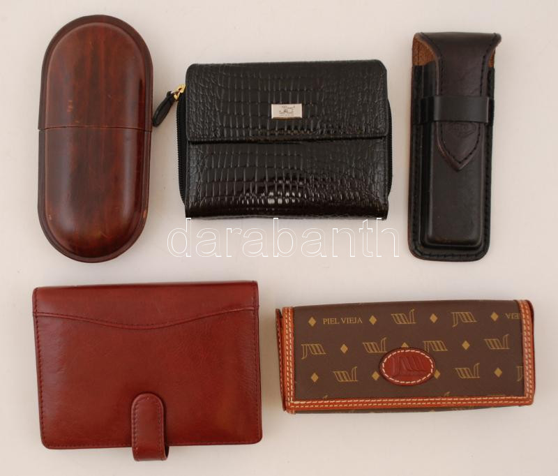 Beschreibung: Bőr pénztárca, szemüvegtok, tolltartó, h:15 cm összesen: 5 db