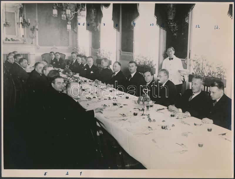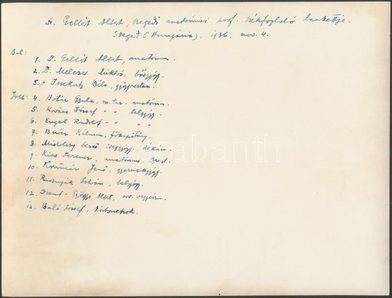 1936 Gellért Albert (1894-1967) szegedi anatómiaprofesszor székfoglaló bankettje, a résztvevők sorában többek között Szent-Györgyi Alberttel és Issekutz Bélával, csoportkép, hátulján feliratozva, 18×23,5 cm