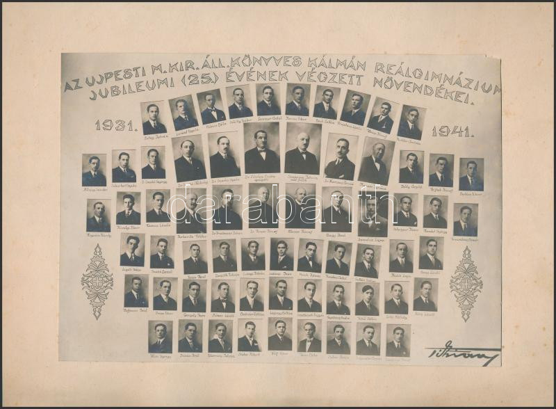 Beschreibung: 1941 Budapest, Könyves Kálmán reálgimnázium végzett növendékeinek kistablója, 65 nevesített portréval, 16x22 cm, karton 21x28 cm