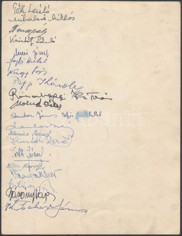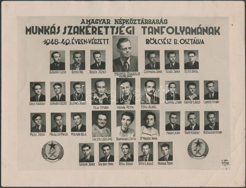 1949 A Magyar Népköztársaság munkás szakérettségi tanfolyamának végzett bölcsész osztálya, kistabló 30 nevesített portréval, hátoldalán aláírva, sarkán törésvonal, 18x23 cm
