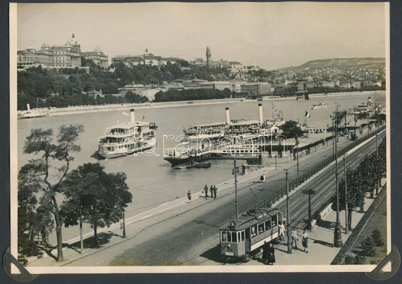 Beschreibung: cca 1930 Budai vár hajóállomással és a 16-os villamossal, fotó, 12x17cm
