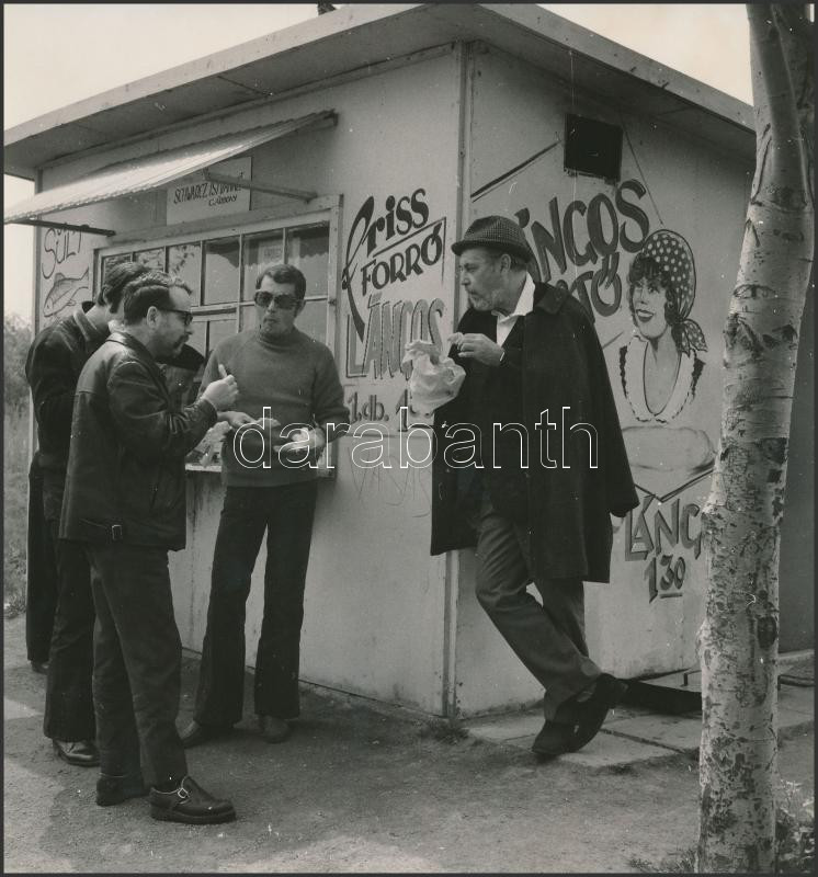 Beschreibung: cca 1972 Várkonyi Zoltán (1912-1979) kétszeres Kossuth-díjas filmrendező Gárdonyban Schwartz Istvánné lángos sütödéjénél, vintage fotó, 19x18 cm