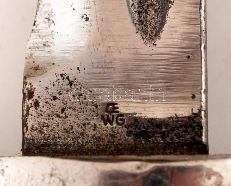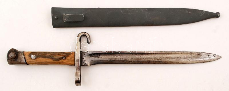 Beschreibung: cca 1914-1918(?) Mannlicher szurony, pótolt fa markolattal, újrafestett, kicsit sérült fém hüvelyben, pengehossz: 22 cm, teljes hossz: 33,5 cm