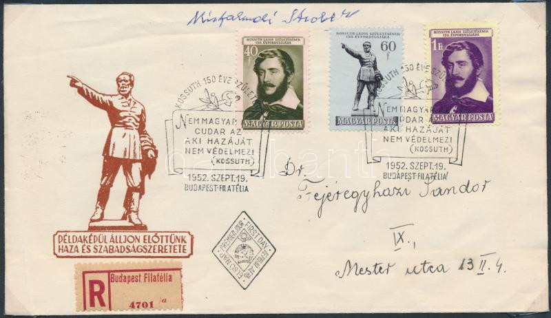 Beschreibung: 1952 Kisfaludy Stróbl Zsigmond szobrászművész aláírása munkáját ábrázoló bélyegeket tartalmazó FDC-n
