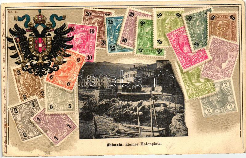 Beschreibung: Abbazia, Kleiner Hafenplatz, coat of arms, stamps, Ottmar Zieher Philatelie-Ansichtskarte No. 222744., Emb., litho (pinhole)