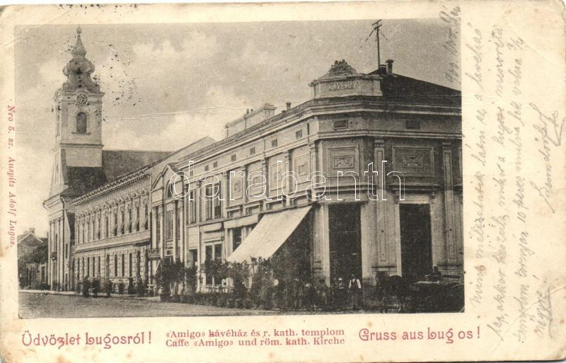 Lugos, Lugoj; Amigo kávéház, római katolikus templom / cafe, church (f... https://www.darabanth.com/de/269-Fernauktion/269.0/Ansichtskarten/Siebenburgen~300037/Lugos-Lugoj-Amigo-kavehaz-romai-katolikus-templom-cafe-church-fa~II1358069