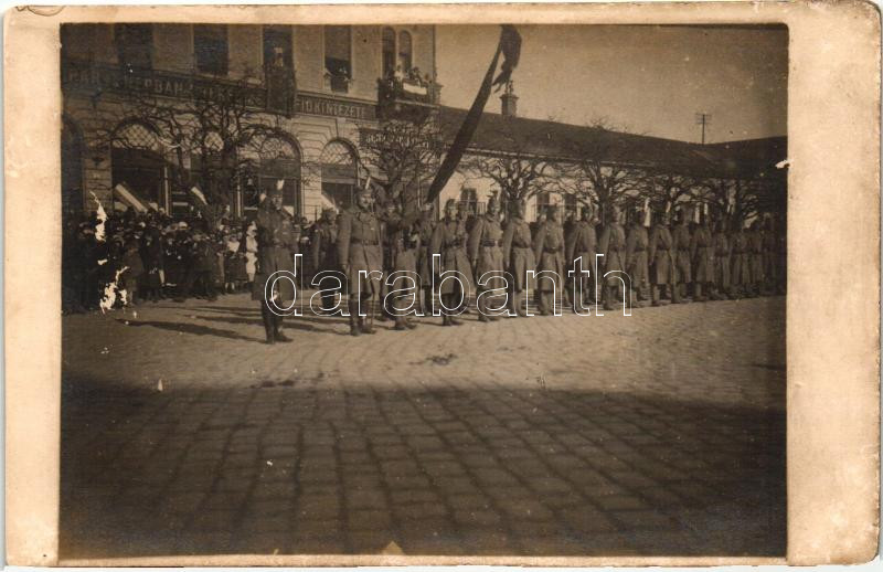 Békéscsaba, Szent István tér, Laszky-ház, az Aradi Ipar- és Népbank Békés megyei fiókja, Schwartz József üzlete; Nemzeti Hadsereg, darutollas katonai csoportkép, cca 1919 / photo