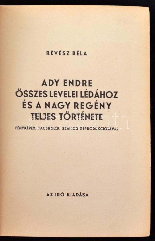 Révész Béla: Ady Endre összes levelei Lédához és a nagy regény teljes története fényképek, facsimilék számos reprodukciójával. Bp. 1942, Szerzői kiadás. 608 p. 13 t. Kiadói félvászonkötésben.