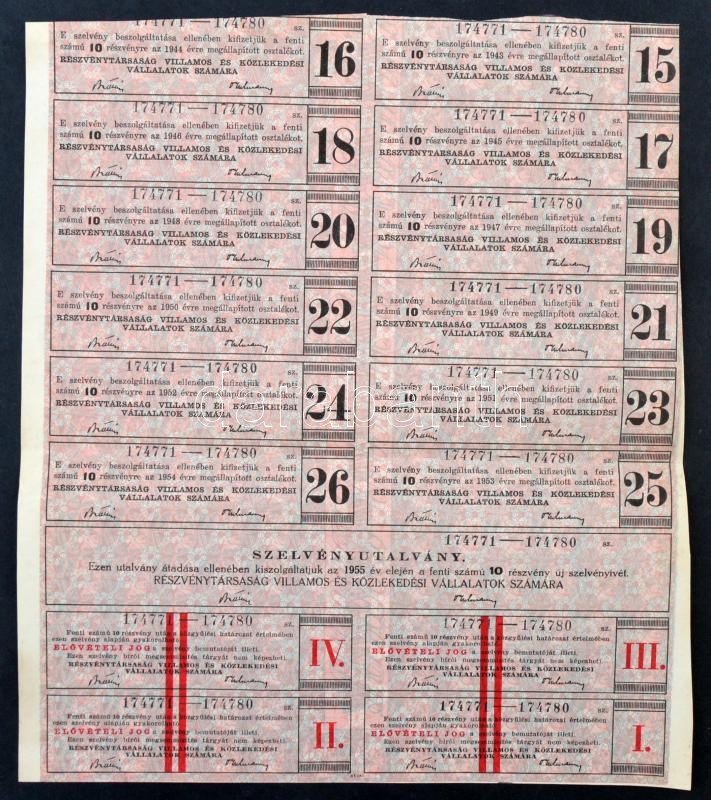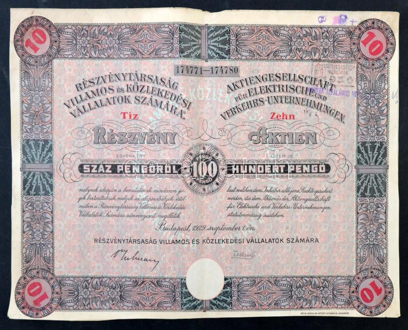 Budapest 1929. "Részvénytársaság Villamos és Közlekedési Vállalatok Számára" 10 részvénye egyenként 100P-ről, szelvényekkel, bélyegzéssel és szárazpecséttel T:III
