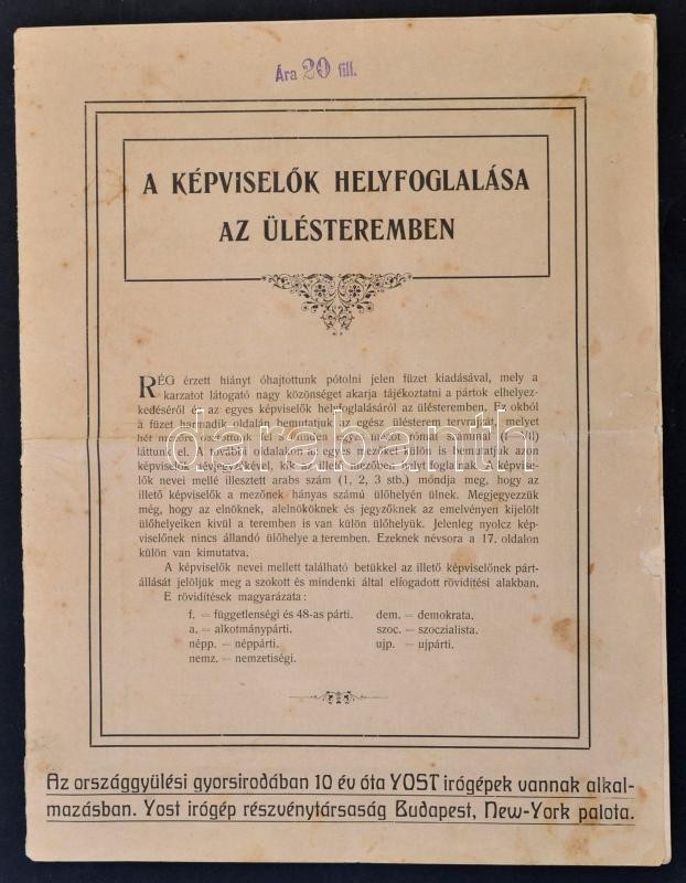 Beschreibung: cca 1910 A képviselők helyfoglalása az ülésteremben. Ábrákkal, teljes névsorral. 20p.