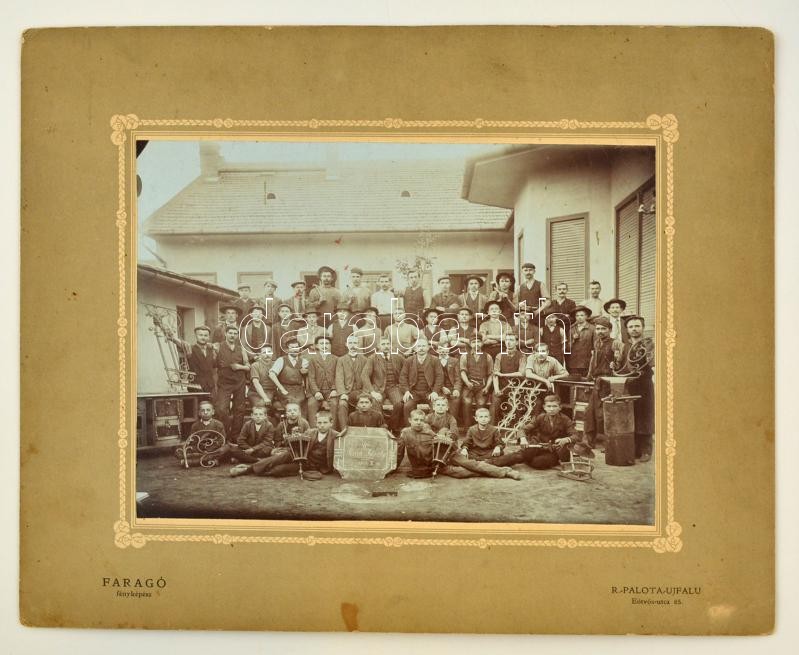 Beschreibung: 1909 Rákospalota-Ujfalu kovácsoltvas és diszműkovács termékeket előállító műhely dolgozói. Mesterek és inasok termékekkel. Nagyméretű tablókép. 39x32 cm