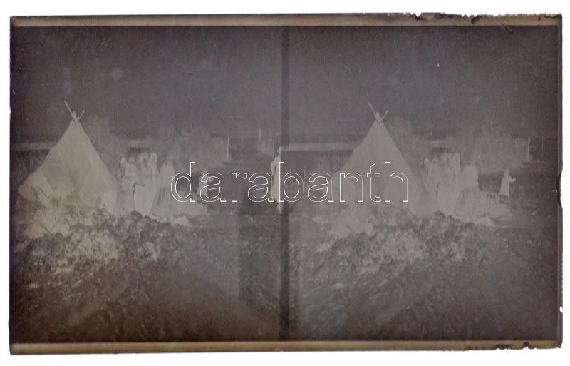 Beschreibung: cca 1925 Vándorcigányok a falu szélén felállított sátruk mellett, 1 db sztereo üveglemez negatív képpár, 6x13 cm