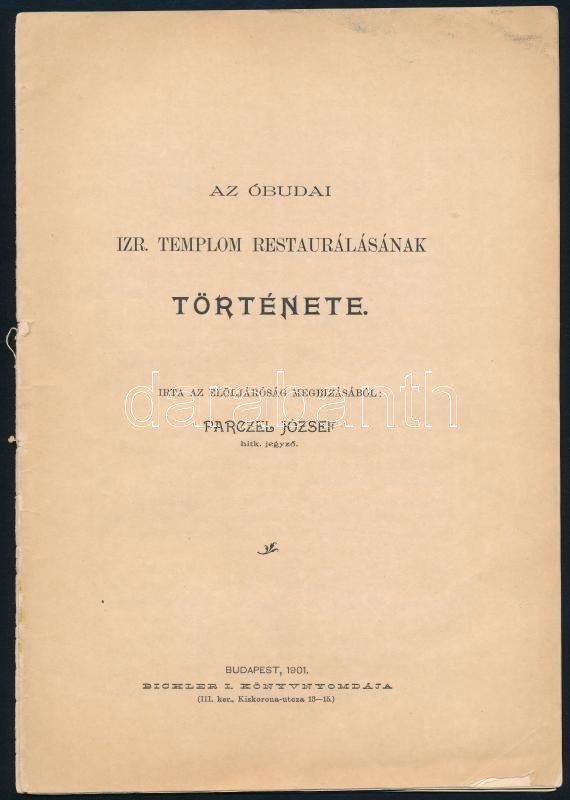 1901 Bp., Parczel József: Az óbudai izraelita templom restaurálásának ... https://www.darabanth.com/de/27-Gross-Auktion/27.1/Andere-Sammelgebiete/Judaica~10890/1901-Bp-Parczel-Jozsef-Az-obudai-izraelita-templom-restauralasanak-tortenete-kiadja-Bichl~II1582833